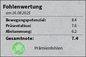 EinsatzSport- und Turnierpferd AusbildungGrundausbildung TrainerJared Büttner startetFohlenschau Turnierstarts und -platzierungenNachkommen