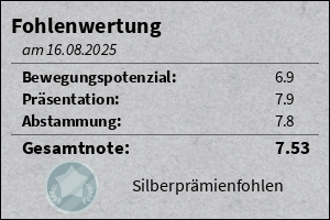 EinsatzSport- und Turnierpferd AusbildungGrundausbildung TrainerJared Büttner startetFohlenschau Turnierstarts und -platzierungenNachkommen